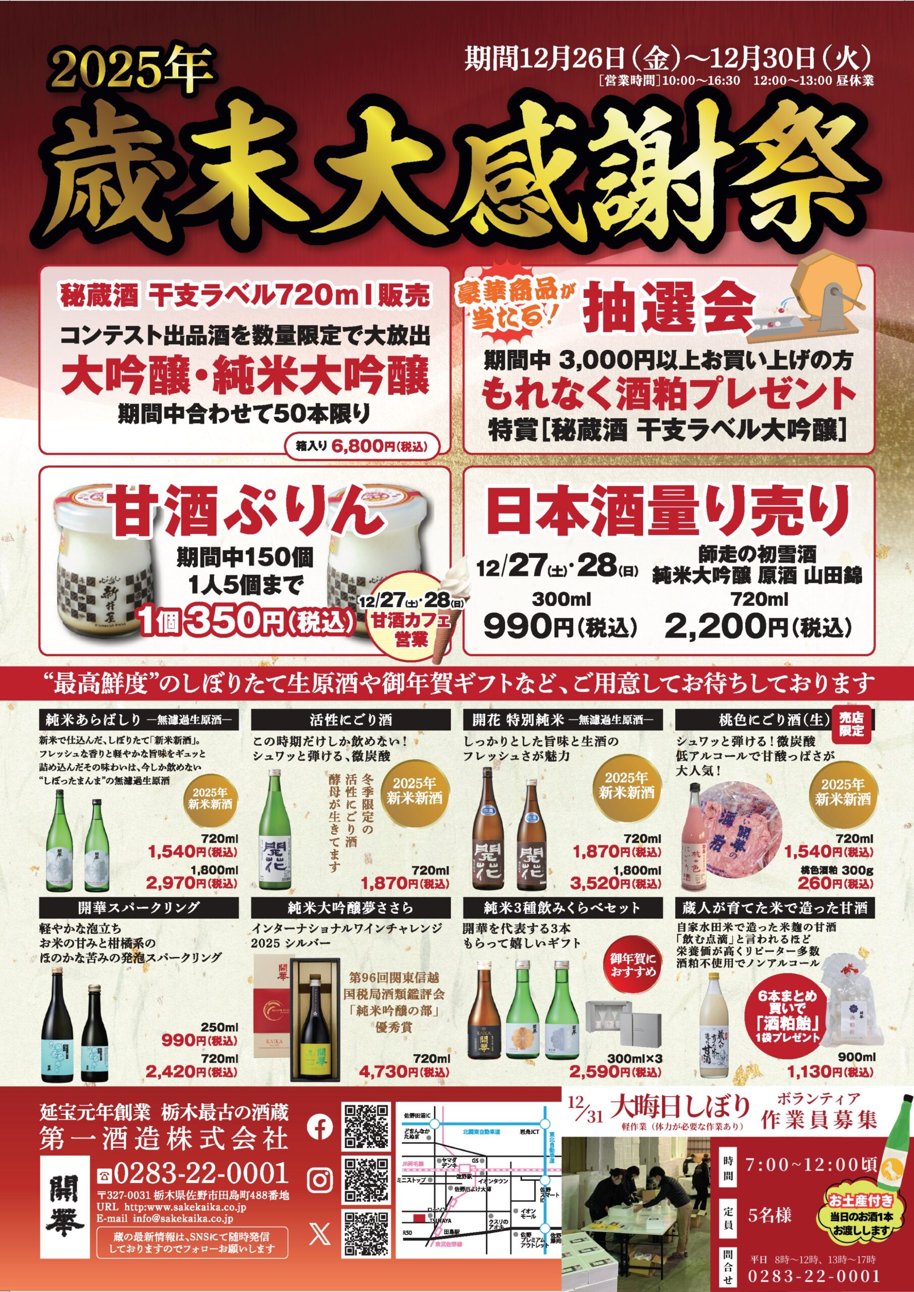 第一酒造では、日頃のご愛顧に感謝を込めて「2025年 歳末大感謝祭」 を開催いたします。期間中は、コンテスト出品用に複数仕込みした非売品のお酒「大吟醸・純米大吟醸の秘蔵酒」を、数量限定で特別販売。 干支ラベルをあしらった年末年始にふさわしい一本をご用意します。 また、日本酒の量り売りや、イベントでしか買えない甘酒ぷりんの販売、豪華商品が当たる抽選会など、酒蔵ならではの企画も盛りだくさんです。 【開催期間】 2025年12月26日(金)〜12月30日(火) 営業時間:10:00〜16:30(12:00〜13:00 昼休業) 【主な内容】 ・秘蔵酒 干支ラベル(720ml)数量限定販売 大吟醸・純米大吟醸あわせて50本限り ・抽選会開催 期間中3,000円(税込)以上お買い上げで、「秘蔵酒 干支ラベル大吟醸」が当たるチャンス 参加全員に酒粕プレゼント! ・日本酒 量り売り(12/27・28限定) 純米大吟醸 山田錦 原酒をお楽しみいただけます(300ml,720ml,1800ml) ・甘酒ぷりん販売 甘酒カフェ監修・数量限定 ・AMAZAKE CAFÉ営業(12/27・28限定) 日本茶やいちごと、開華の麹甘酒を合わせたアレンジドリンクを販売 このほか、「最高鮮度」のしぼりたて生原酒、御年賀・お正月向けの日本酒ギフトなども多数取り揃えております。 年末のご挨拶やお正月の一献に、ぜひ第一酒造へお立ち寄りください。