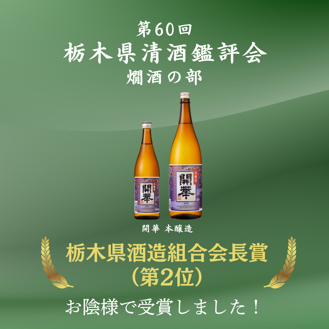 第60回栃木県清酒鑑評会 受賞のご報告 2025/11/25 「新酒祭」を初開催します! 2025/11/15 第96回関東信越国税局酒類鑑評会 優秀賞受賞のご報告 2025/11/14 お年賀ギフトにピッタリ「開華 大晦日しぼり」の予約開始しました 2025/10/29 酒蔵茶屋のご予約状況 【10/15(水)9:15現在】 2025/10/1 awa酒week2025 開催のご案内 2025/9/30 おさんぽ蔵マルシェ開催のご案内(10/25,10/26) 2025/9/24 酒蔵茶屋2025、9/1受付開始です 2025/8/18 「全国きき酒選手権大会2025 栃木予選会」を開催します! 2025/7/30 9/6(土)「ささらライトキューブ~栃木酒蔵サミット~」に出店します 2025/7/30 8/20(水)さけくらべ 栃木in宇都宮に出店します 2025/7/7 令和6酒造年度(令和7年)全国新酒鑑評会 金賞受賞のご報告 2025/5/23