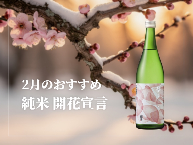 2月のおススメ商品 『純米 開花宣言』 2026/2/4 毎春人気、花がほころんだら封を開けたい「開花宣言」。 さっぱりとした柑橘系の香り、ふくらみのある旨みと穏やかな甘味・酸味が調和した地酒です。 満開の桜を彷彿させる味わいの純米酒です。 お取り寄せも承っております。 アルコール分 15度 精米歩合 60% おススメの飲み方 冷酒・常温 内容量 720ml, 1800ml ご購入はこちらから